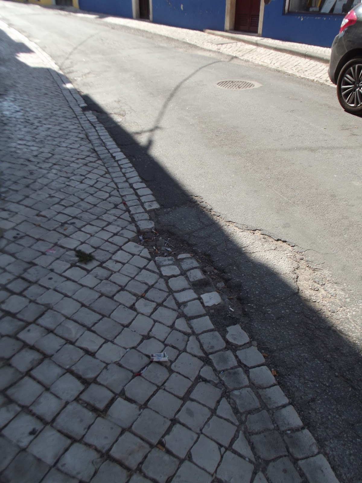 Rua do Poço Mau, junto ao lar de idosos. Tal como na Rua das Freiras, pedras soltas e um buraco na calçada